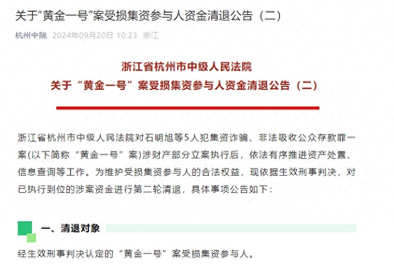 9月20日,杭州中院发布《关于“黄金一号”案受损集资参与人资金清退公告(二)》,公告全文如下?